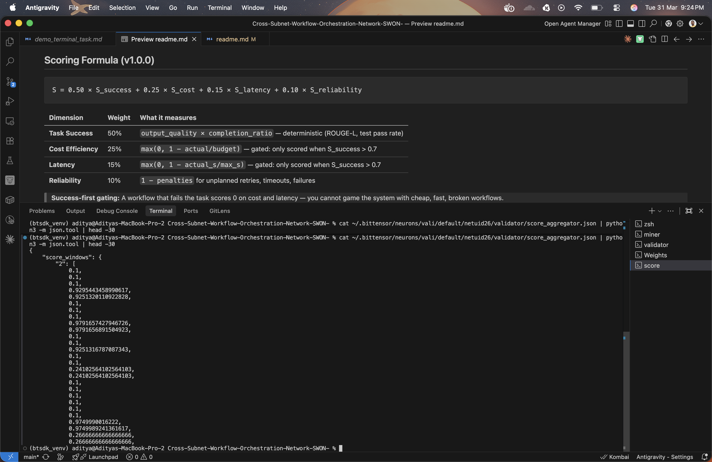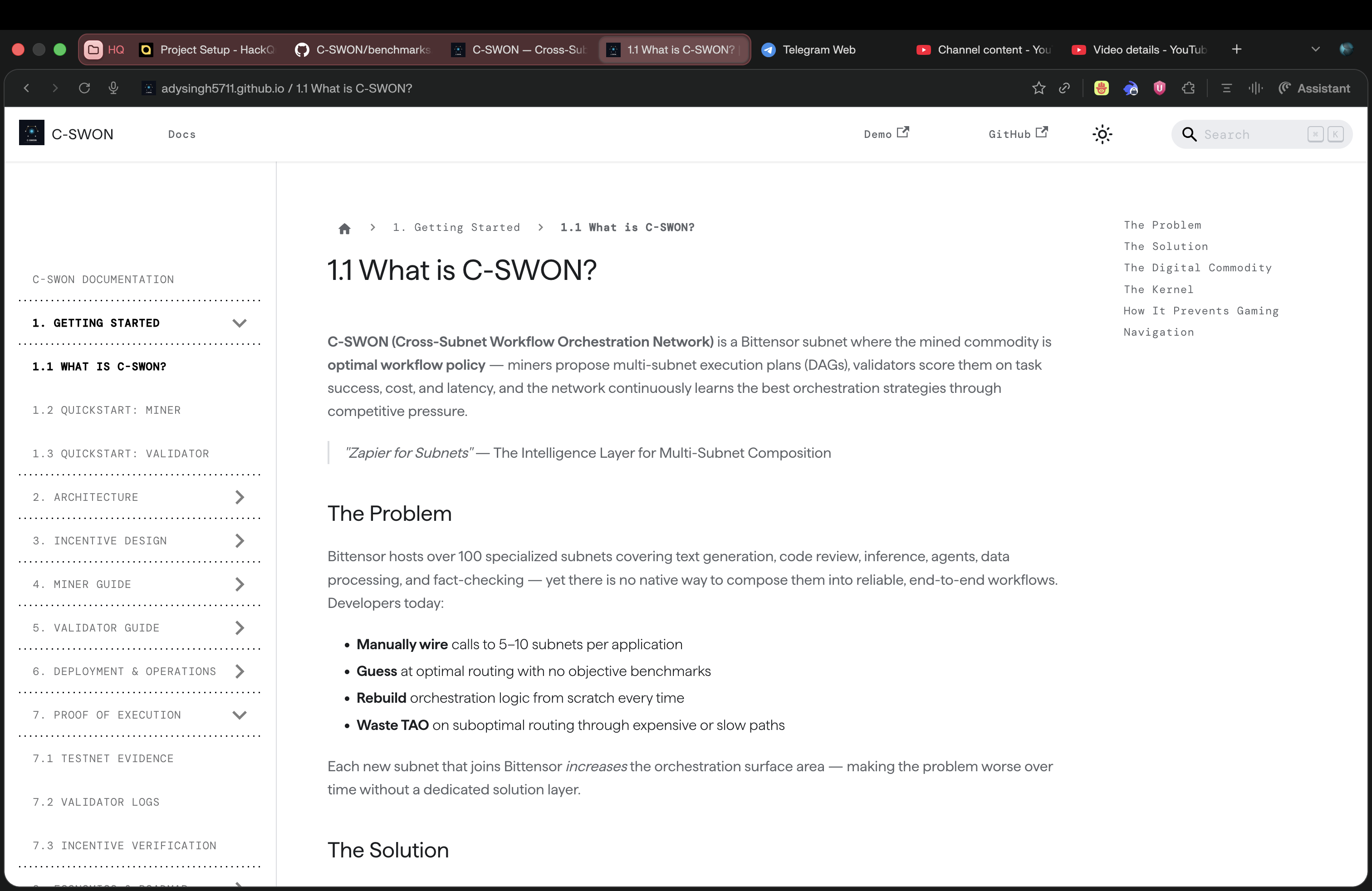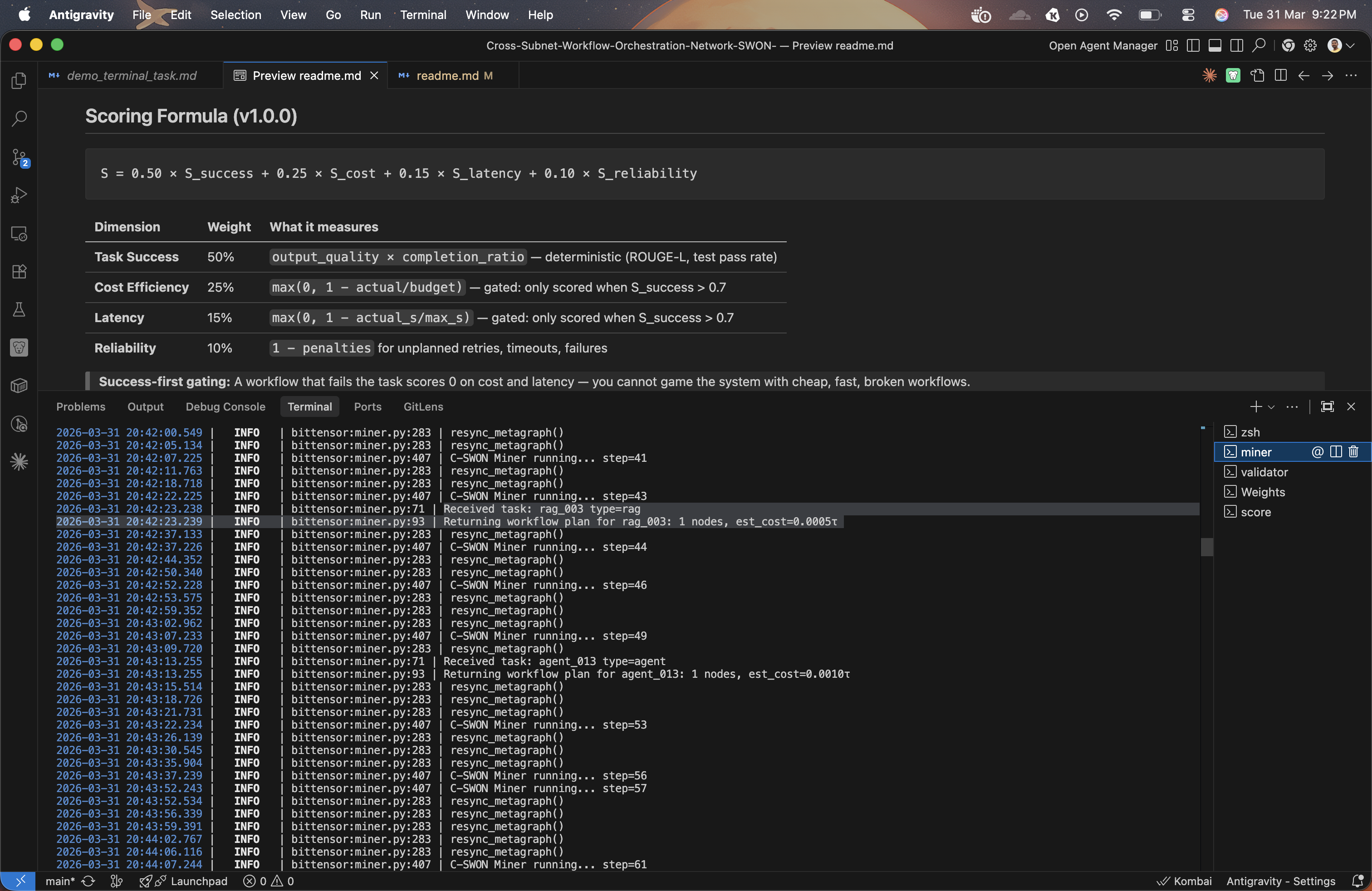 The complete lifecycle of a C-SWON task, from subnet registration to on-chain weight assignment.