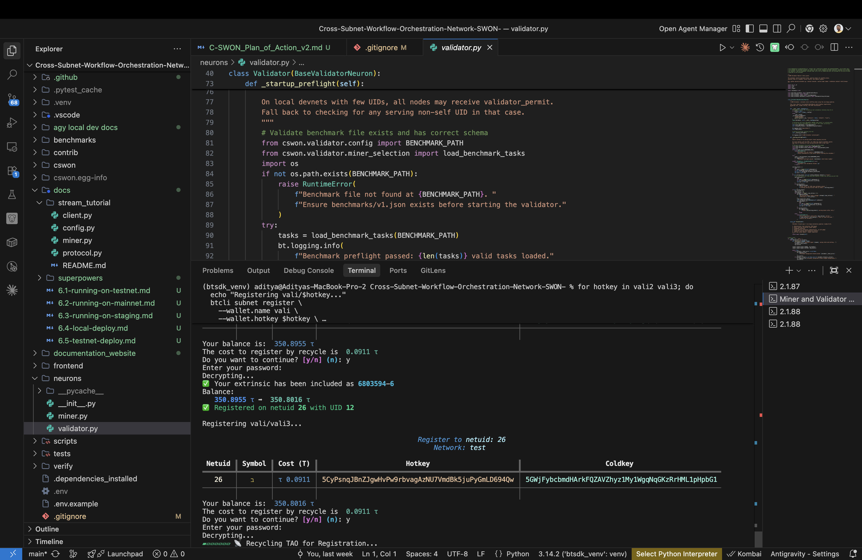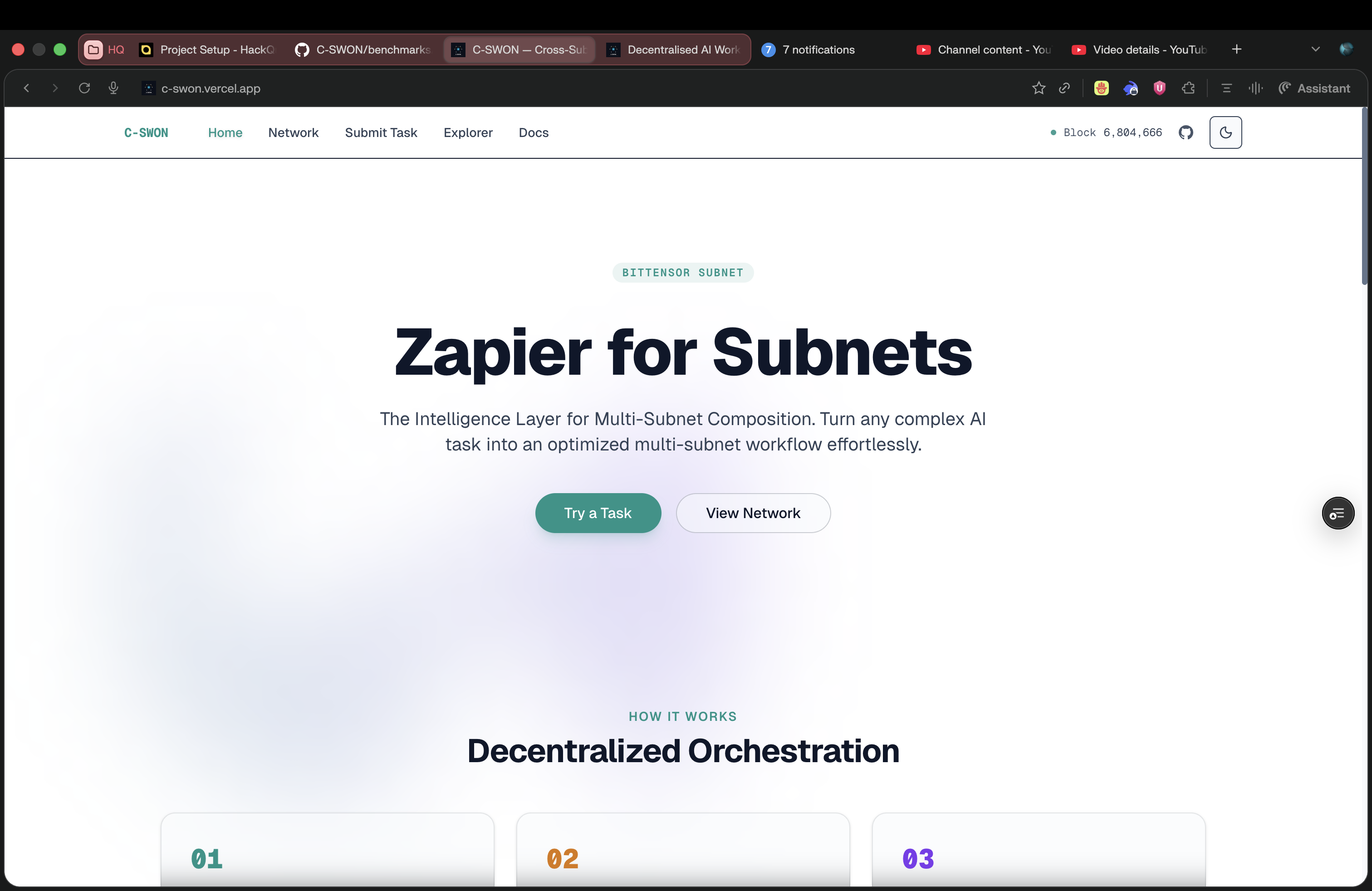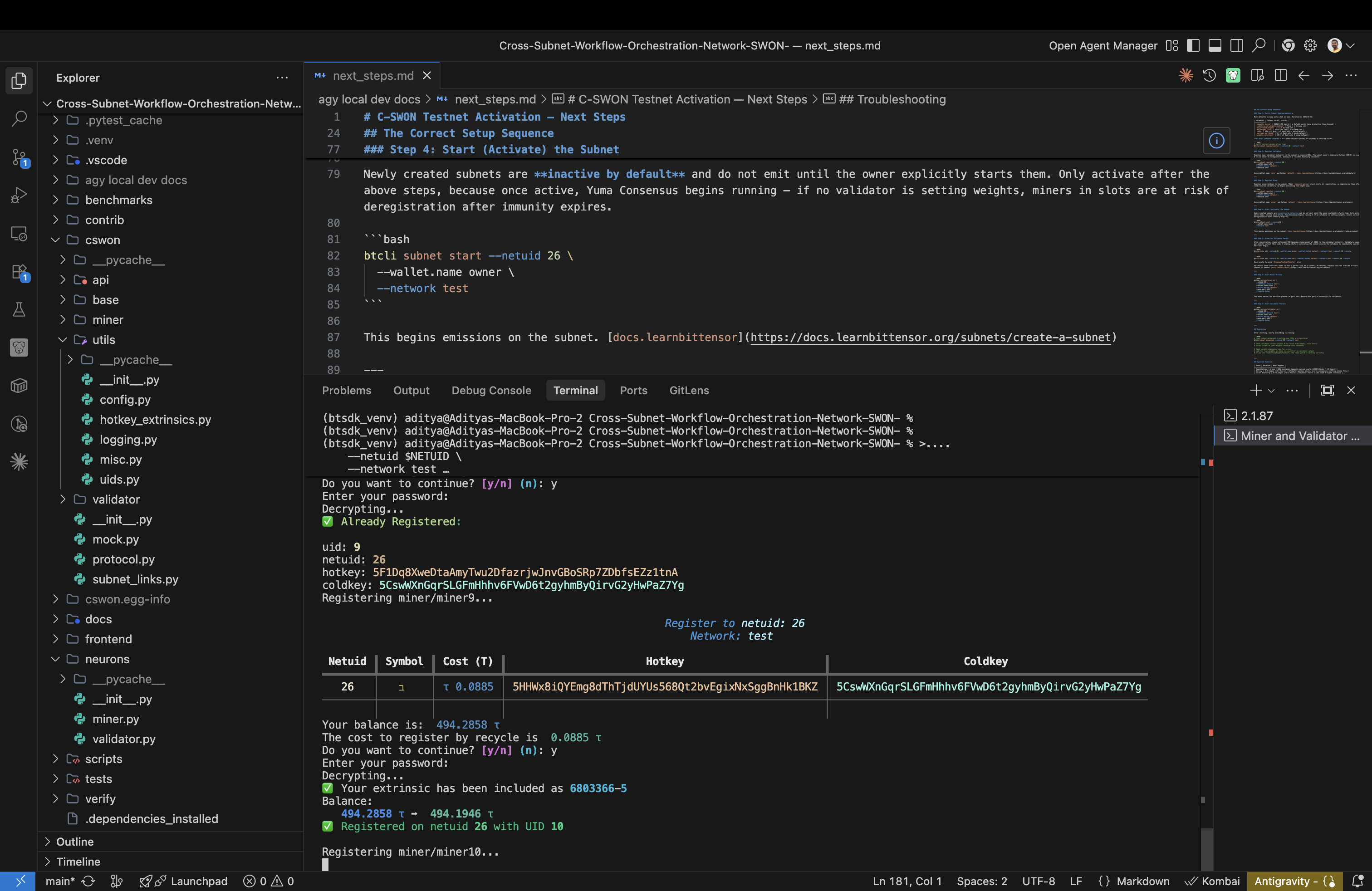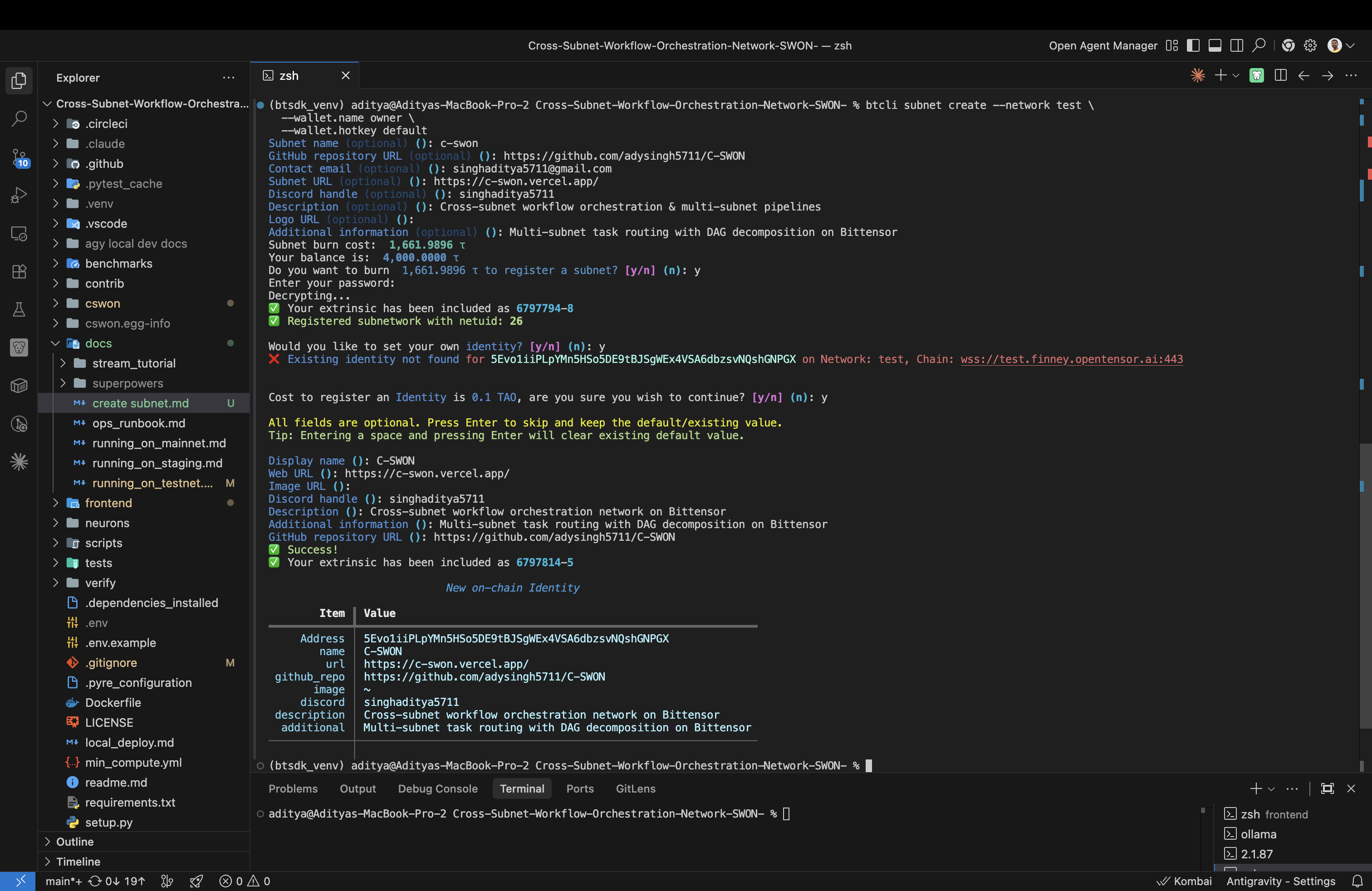 On-chain proof that C-SWON is deployed and operational on the Bittensor testnet.